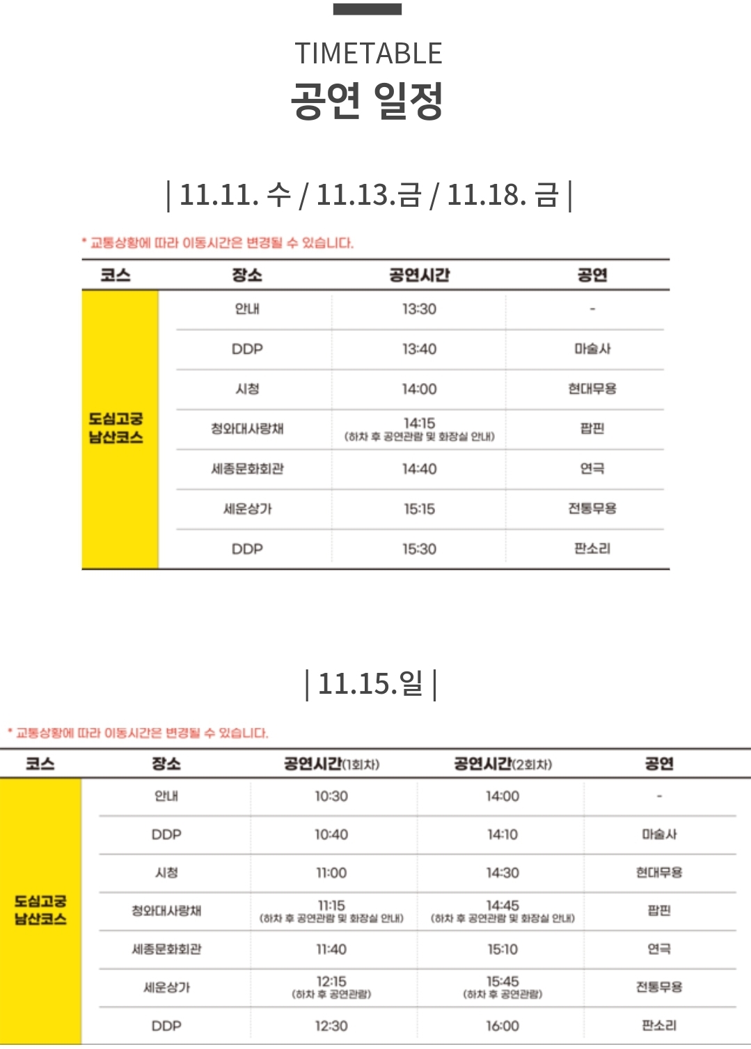 - 서울시티투어 특성상 모든 공연이 야외에서 진행되므로, 기상 악화 시 프로그램이 취소될 수 있는 점 미리 양해 부탁드립니다. ( 공연 취소시 다른 날짜로 변경 불가)