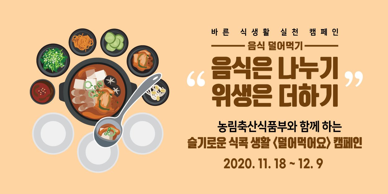 음식은 나눠서 덜어먹고 위생은 지키면서 올바른 식사문화를 형성 하고자 온라인 바른 식생활 실천 캠페인으로 <음식은 나누기 위생은 더하기> 를 진행합니다