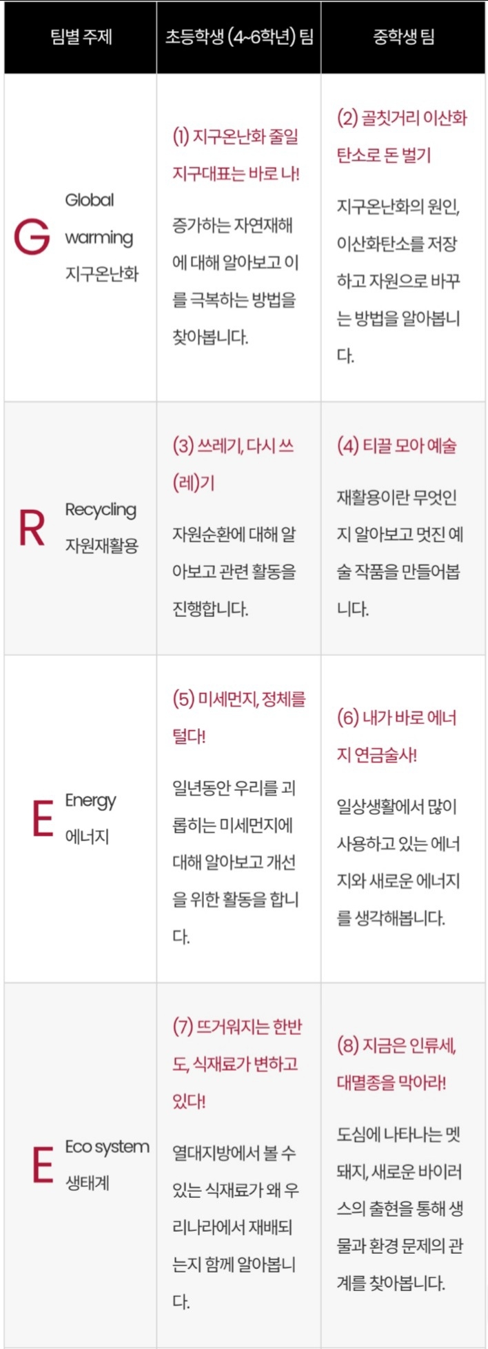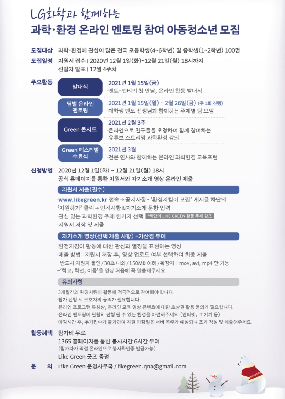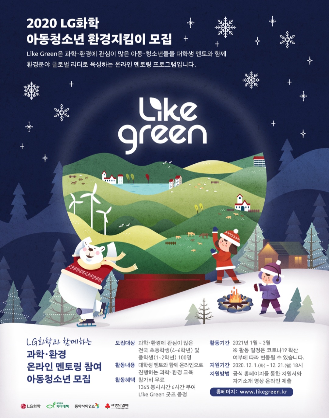 이런 LG화학은 고객의 삶과 사회 전반에 환경 가치를 제공하기 위한 노력을 기울이고 있어 화학놀이터/화학캠프, 화학탐구 프런티어 페스티벌, 희망Green발전소 프로그램, 그린 리모델링 프로그램, 에너지 동반성장 등 다양한 사회공헌 활동을 진행하고 있는데 LG화학 아동청소년 환경지킴이 모집도 그 활동 중 하나라고 할 수 있겠죠? ^^