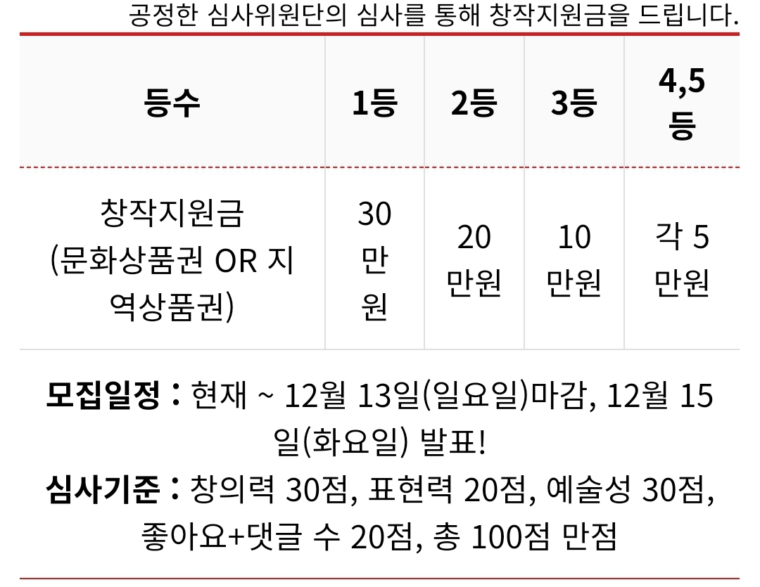 심사기준은 창의력, 표현력, 예술성이고 유투브를 통해 좋아요+댓글수로 인해 점수가 올라가니 이 점을 명심하시면 1등 확률이 더 높겠죠? ^^