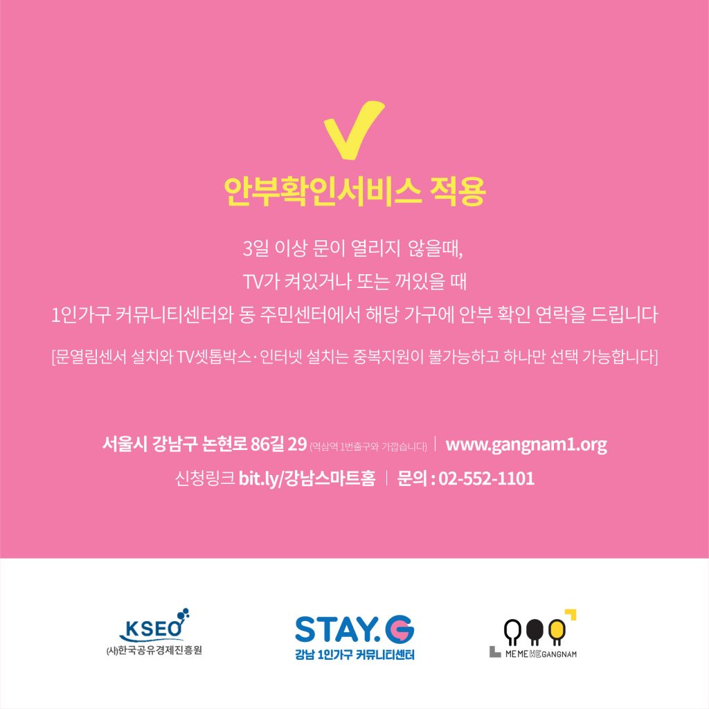 문 의 : 02-552-1101, 카카오채널 ‘STAY.G 강남 1인가구 커뮤니티센터’