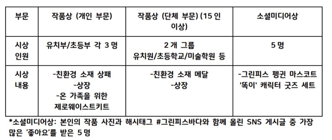 *유치원이나 초등학교, 미술학원 등 여러 참가자가 단체로 챌린지에 참여할 수도 있어요! 15인 이상이 챌린지에 참여하는 경우는 단체 부문으로 개별 심사합니다. 단체 부문에 응모하실 분들은 대표자(교사 등)가 작품 사진 파일을 모아 메일로 단체 이름과 참여자 이름을 함께 기재해 별도로 응모해 주세요. (vkr@greenpeace.org)