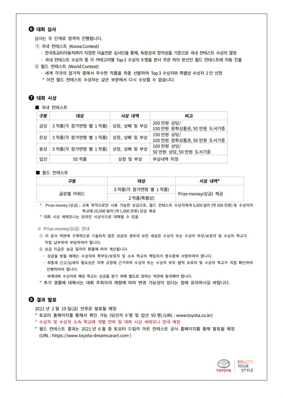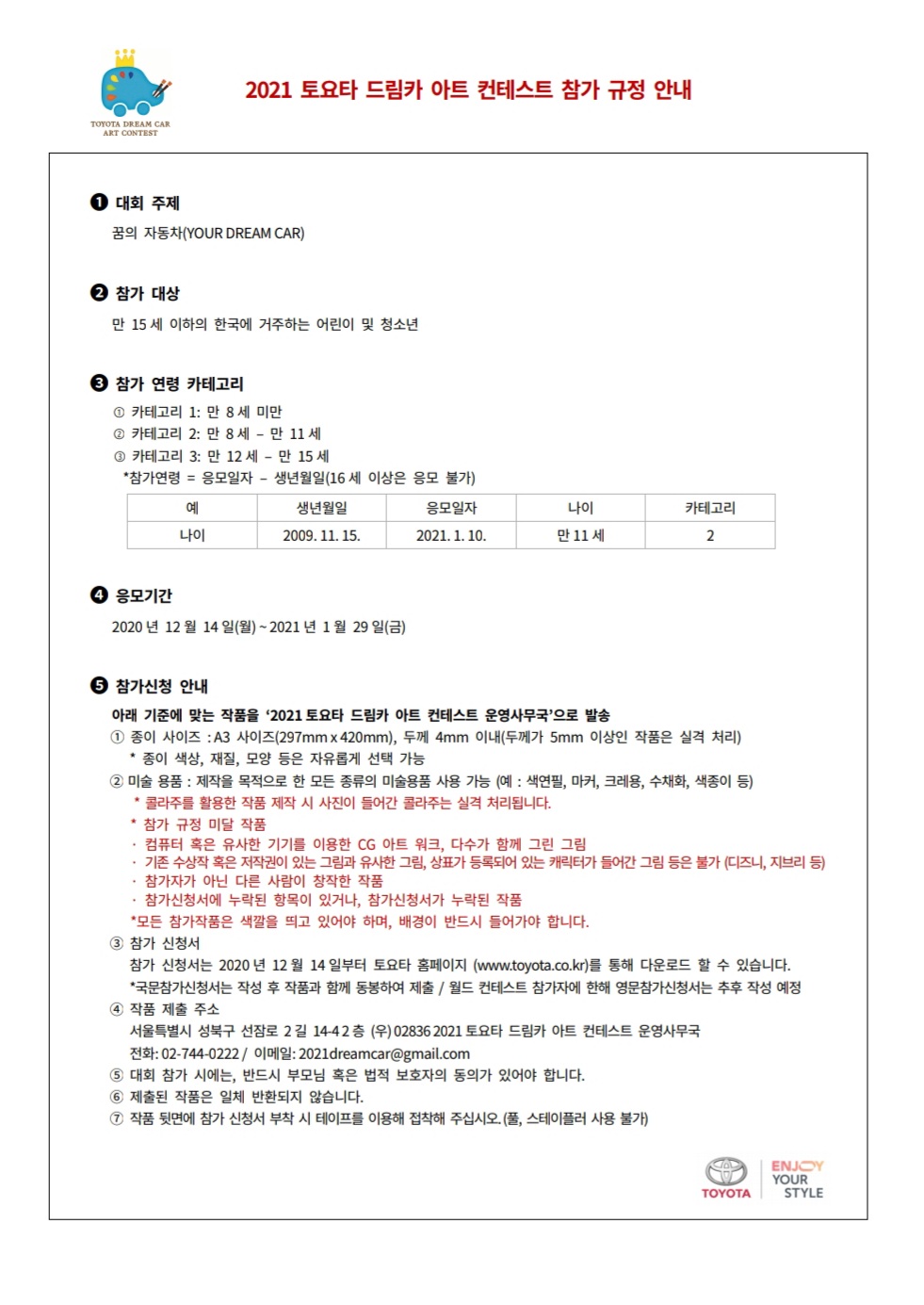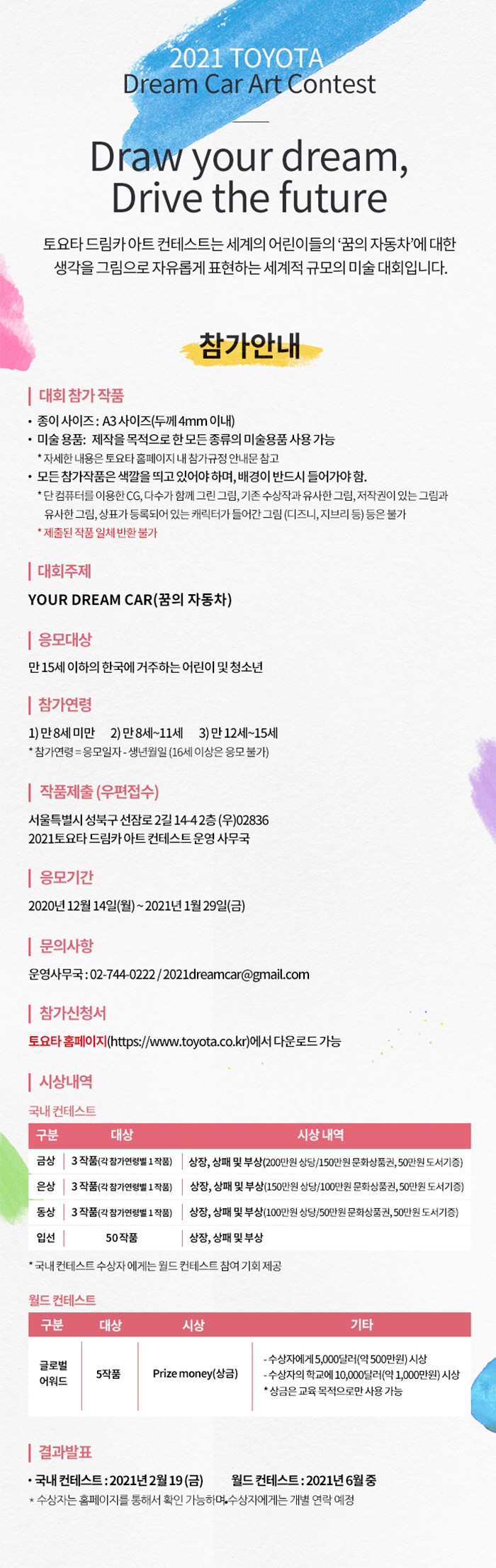 토요타코리아는 12월 14일부터 2021년 1월 29일까지 ‘2021 토요타 드림카 아트 콘테스트(Dream Car Art Contest)’를 개최합니다.