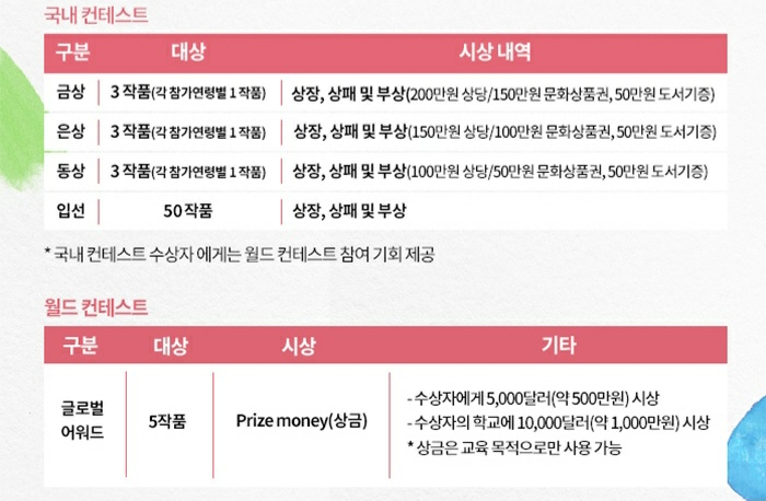 만 15세 이하의 국내에 거주하는 어린이 및 청소년이면 누구나 응모 가능하며, ▲만 8세 미만, ▲만 8세 이상~11세 이하, ▲만 12세 이상~15세 이하 등 세 부문으로 나눠 진행됩니다.