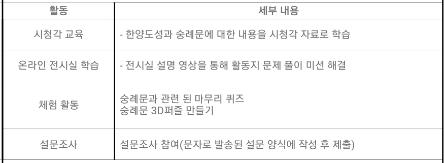 한양도성의 정문인 숭례문을 주제로 조선시대 성문의 구조와 형태에 대해 알아보고 숭례문의 의미와 상징성, 숭례문의 역사에 대해 집에서 학습할 수 있는 기회를 제공합니다.