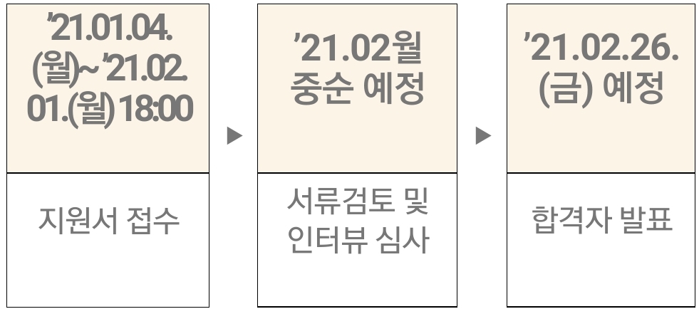접수기간 : 2021.01.04.(월) ~ 2021.02.01.(월) 18:00까지 (29일간)