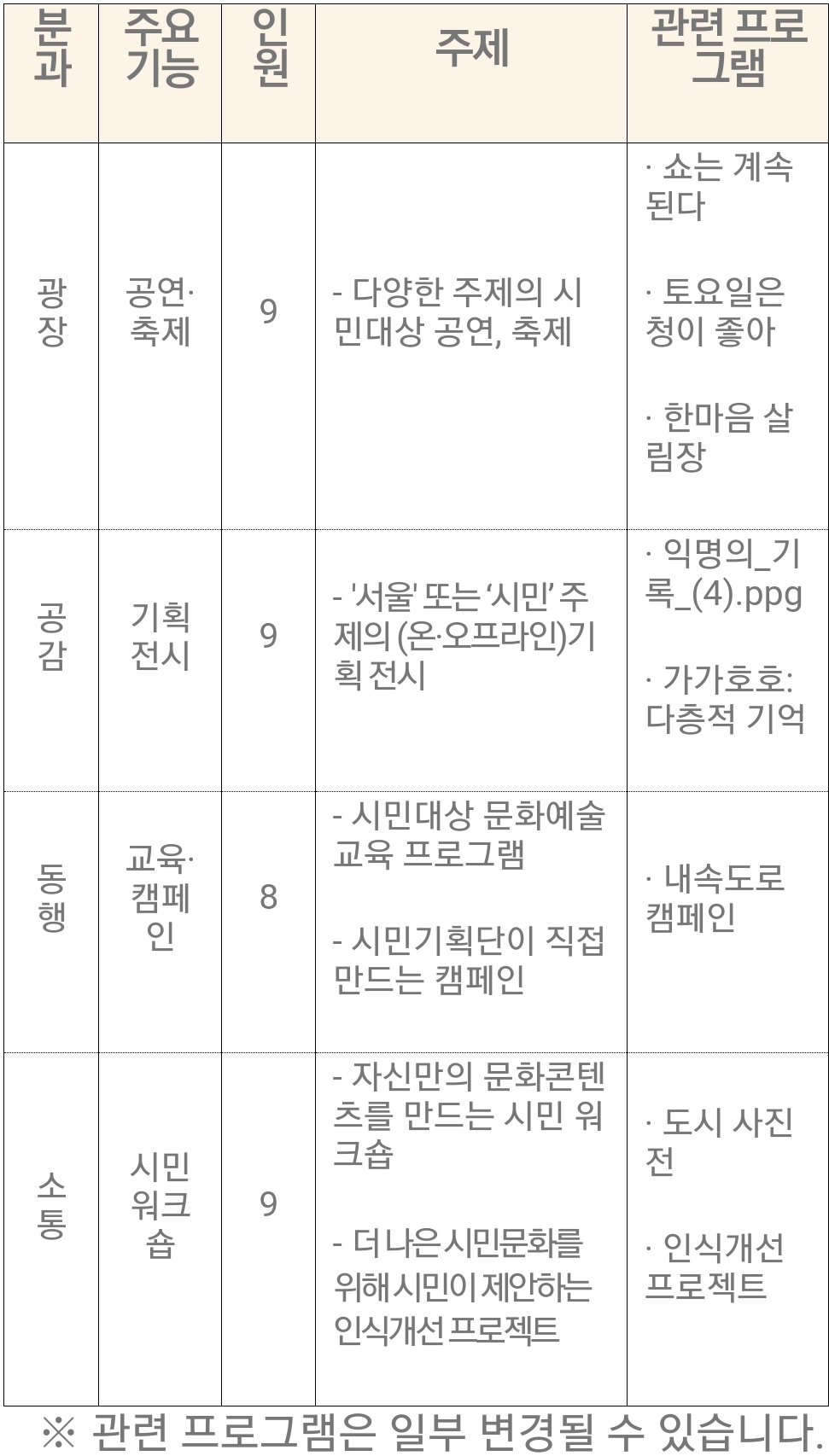 - 해당분과 관련 활동 경험자 : 광장(공연‧축제), 공감(기획전시), 동행(교육·캠페인), 소통(시민워크숍) 등