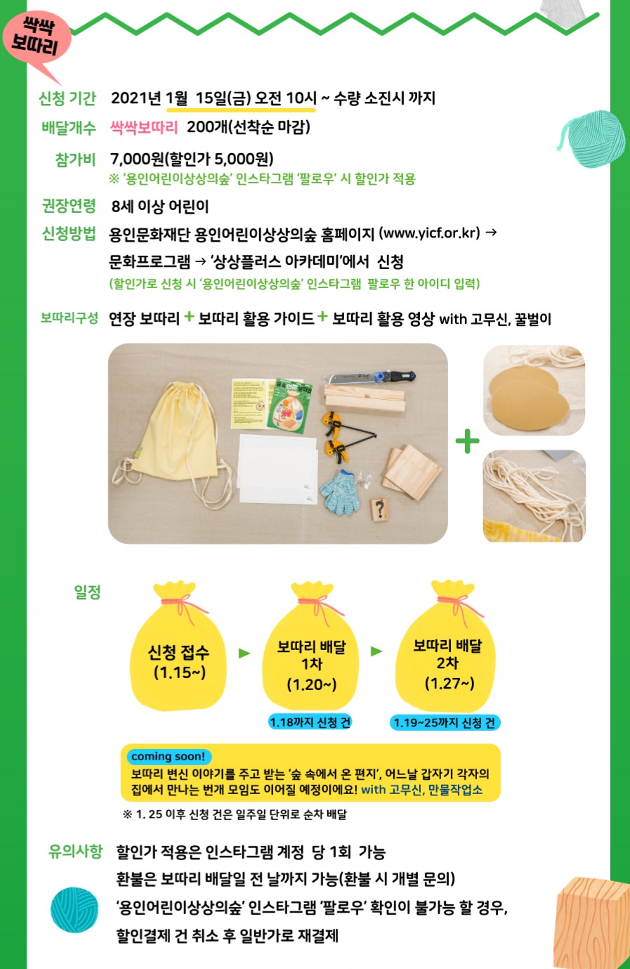 작년 11월 용인어린이상상의숲에서 숲속연장보따리 체험키트의 신청을 받았었는데 노랑킹콩네는 놓쳐서 아쉽게도 신청을 못했었거든요.