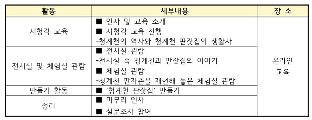 영상으로 제작된 시청각 교육과 전시실 및 체험실 관람으로 청계천의 역사를 학습한 후 청계천 판잣집모형 만들기를 통해 1950~60년대 청계천의 생활사를 알아보는 순서로 진행됩니다.