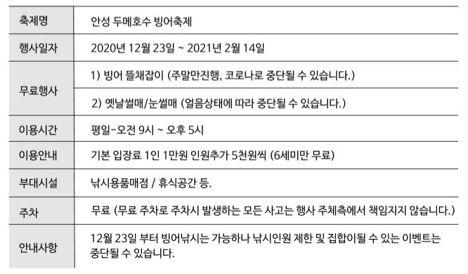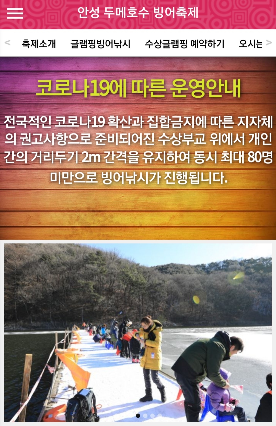 이곳에서는 지금 안성 두메호수 빙어축제 2021이 열리고 있는데 제가 포스팅한 파주송어축제처럼 코로나로인해 축제는 취소되고 빙어낚시만 진행중이였어요.