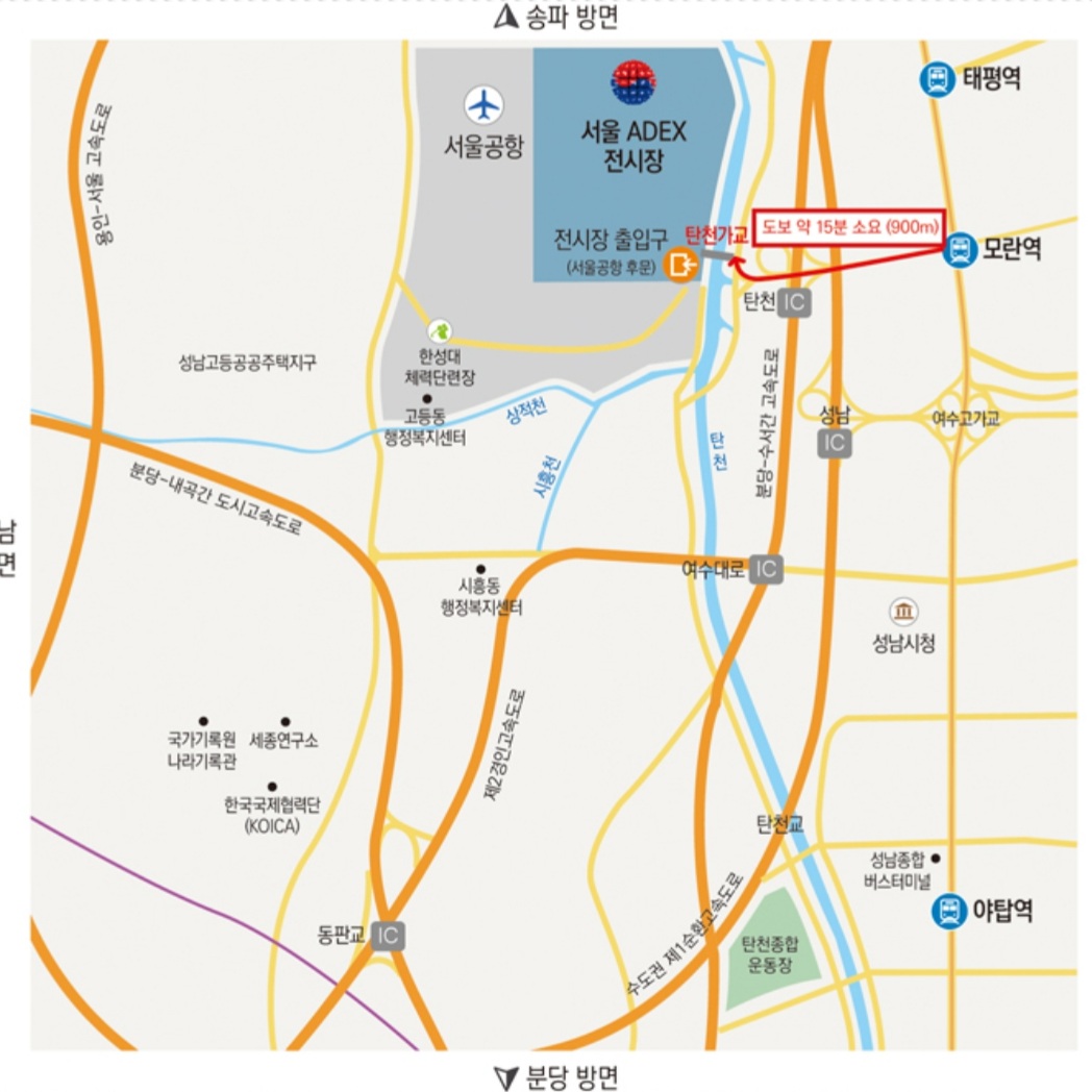 - 대중교통 : 모란역 (8호선/분당선) 8번출구→ 도보 약 15분 (900m)→ 전시장 입구 (탄천)