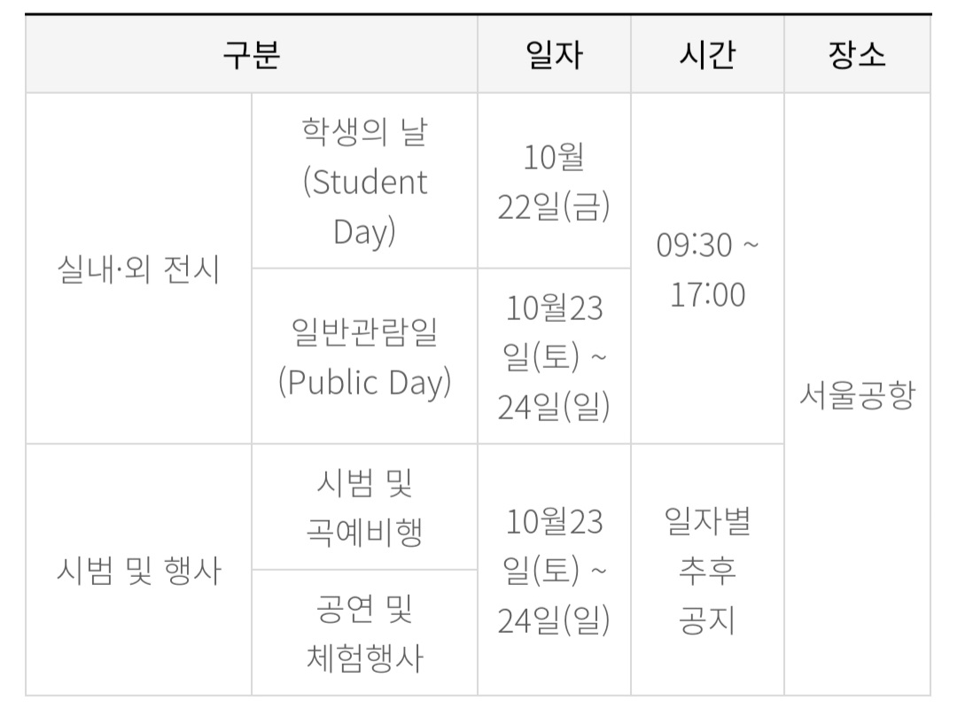 주요행사 : 개막식, 공군 군악음악회, 에어쇼, 항공인의 밤, 학술회의, 홍보관, 항공우주 관련 체험 및 교육, 항공 청소년의 날 등