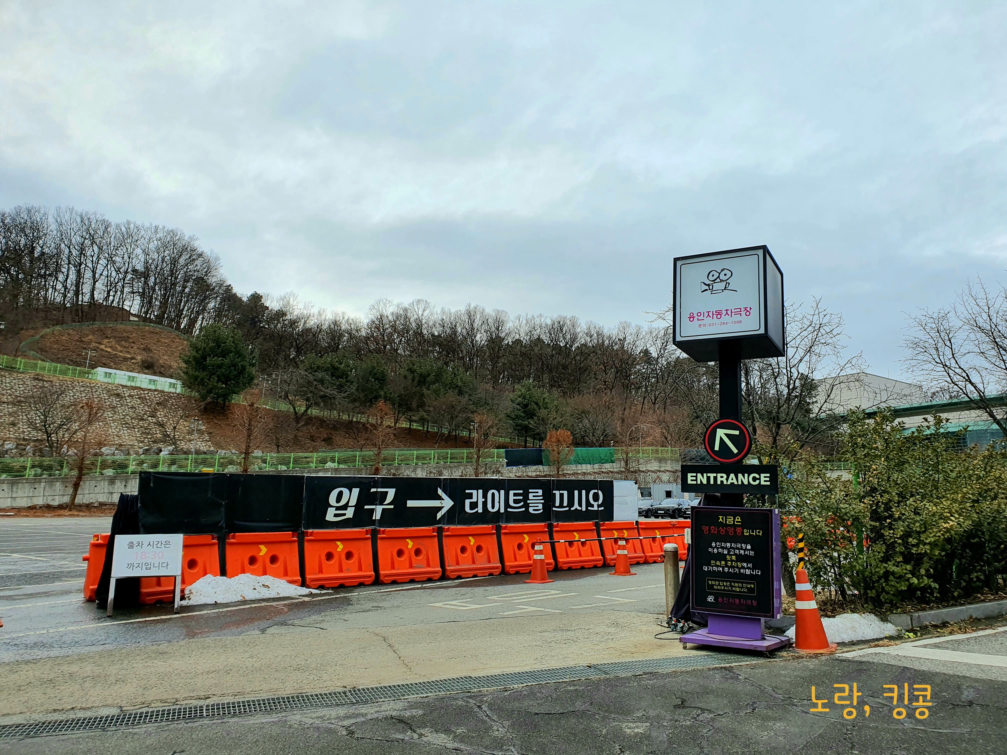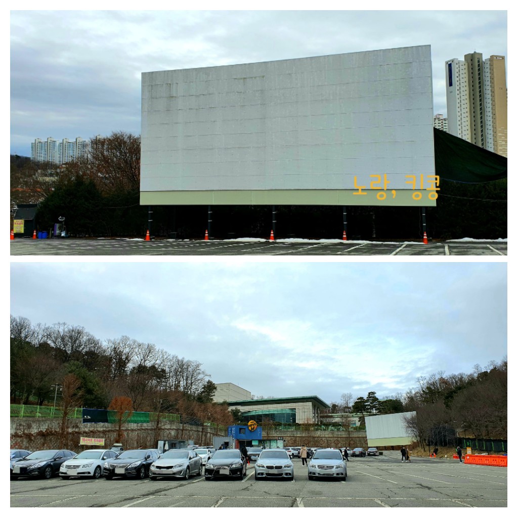 사진을 자세히 보면 차들이 앞쪽을 보고 있고 저뒤에 스크린이 한개가 더 있는데, 가운데 매점을 기준으로 1관 2관 개념으로 나뉘어 자막과 더빙으로 상영을 하고 시간대에 따라 각 각 다른 영화들이 상영됩니다.