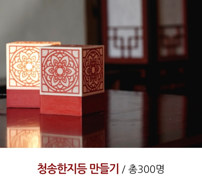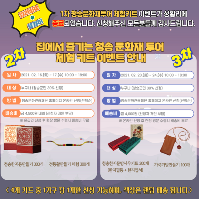 - 개인 SNS에 예쁘게 체험한 키트사진과 #문화재청, #청송문화재사업, #청송문화관광재단 해시태그를 올려주시면 추첨을 통해 다양한 체험키트 증정(윷놀이, 한지등 만들기, 활쏘기, 가죽가방만들기, 컬러링북, 청송한지 문방사우 체험키트 중 랜덤발송)
