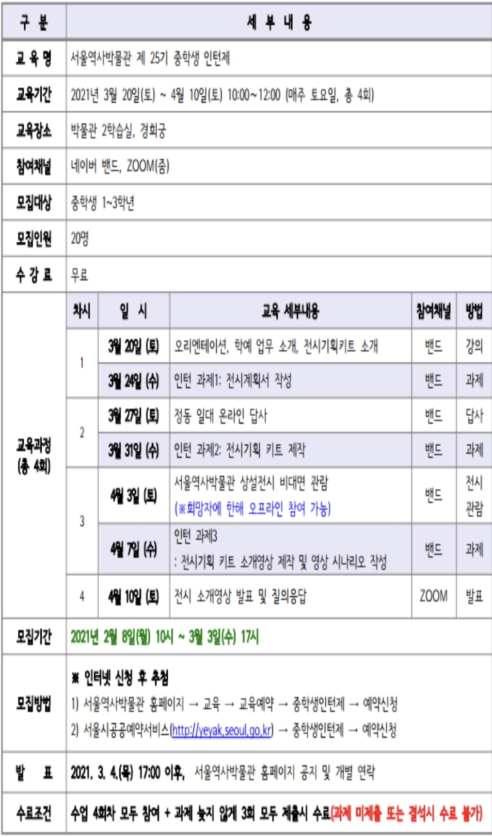 서울역사박물관에서 중학생을 위한 제 25기 ‘중학생 인턴제’ 수강생을 모집합니다.