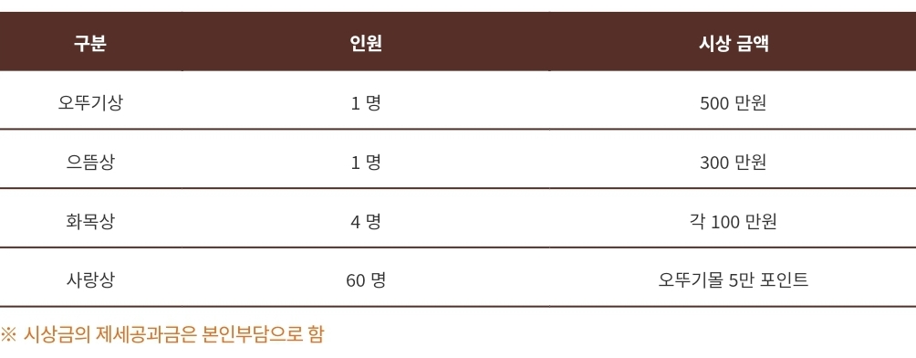 ※ 상금에는 수상작의 저작권 및 소유권 등에 관한 비용이 포함되어있으며, 공모전에 응모할 경우 이에 동의하는 것으로 간주함