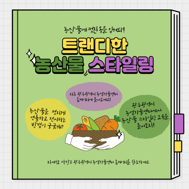 교육내용 : 농산물 상품별 포장・전시 및 연출법, 농산물 직거래 및 온라인 판매 활용법 SNS를 활용한 농산물 스타일링 정보 공유법