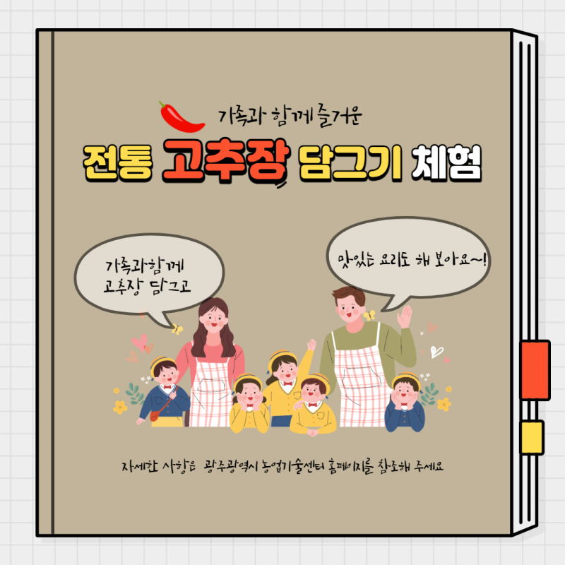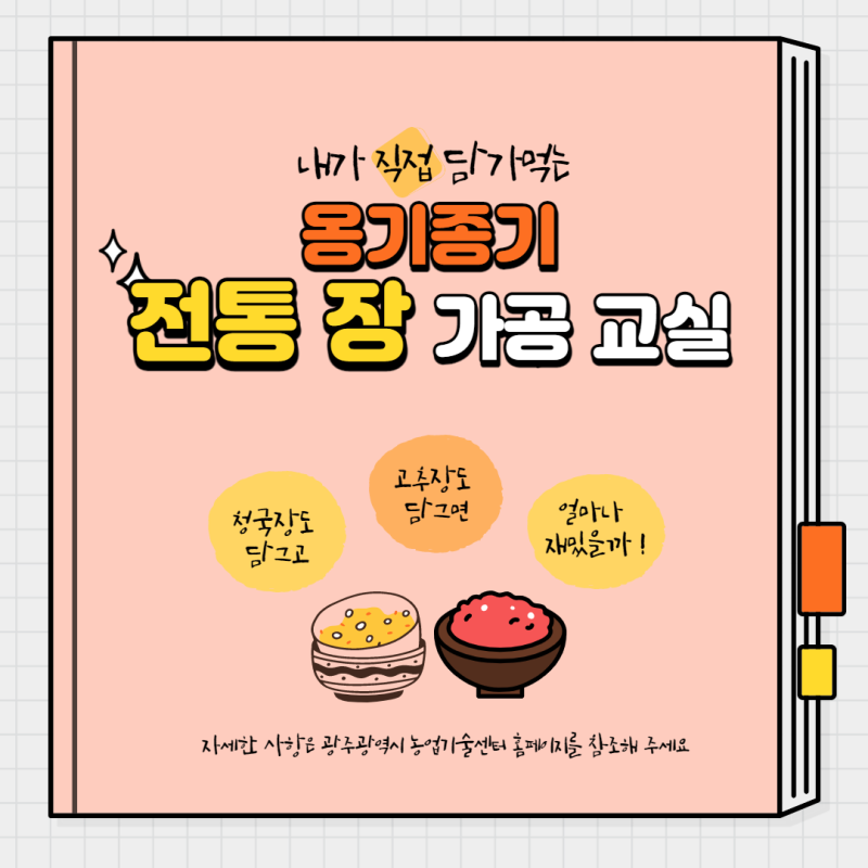 교육내용 : 전통 장류의 발효 및 가공원리를 학습하고 청국장과 고추장을 직접 담그며 전통 식문화에 대해 교육
