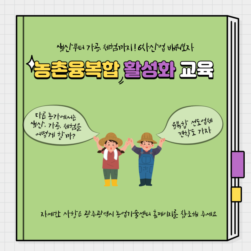 광주광역시농업기술센터는 농촌다움 문화를 확산시키기 위한 ‘농촌생활 활력 증진 교육’ 6개 분야의 교육생을 오는 25일부터 31일까지 선착순 모집합니다.