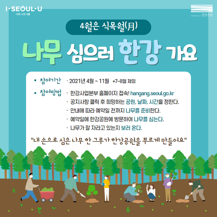 서울시 한강사업본부가 식목월(月)인 4월을 맞아 천만 시민의 휴식공간인 한강공원에 시민이 직접 나무를 심는 ‘나무 심으러 한강 가요’ 캠페인을 진행한다.