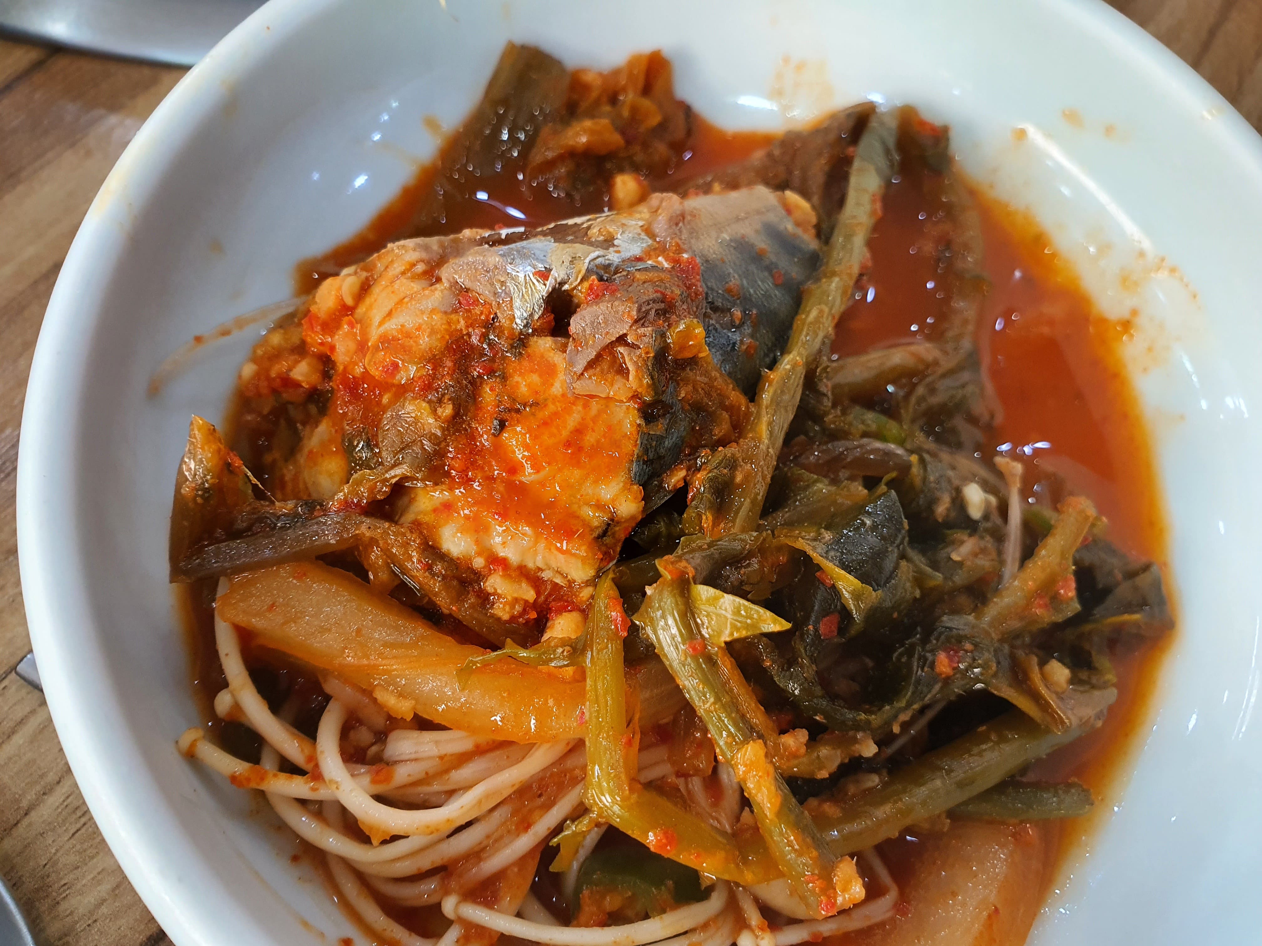 맛있게 매콤한 살이 오른 고등어 한조각과 그냥 먹어도 맛있는 김치를 함께 올려 먹으면 그것이 꿀맛!!!!