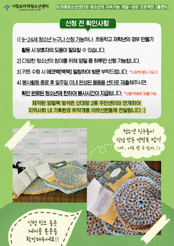활동명 : 기후환경 온앤오프 봉사활동 - 양말목을 활용한 방석 제작 및 지역사회 나눔