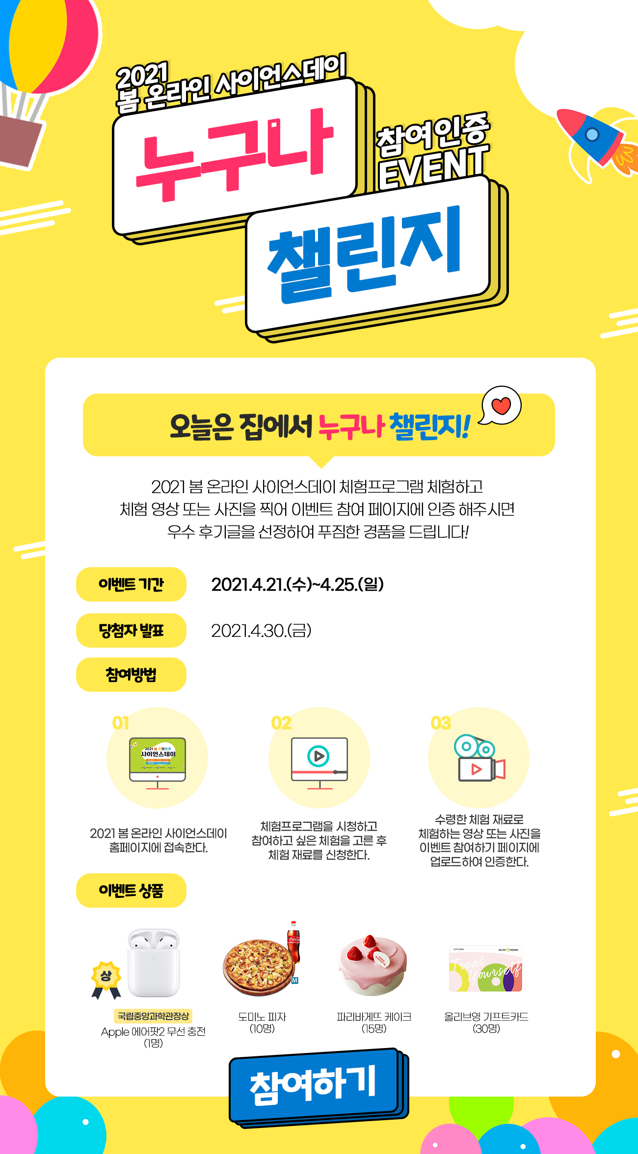 국립중앙과학관은 매년 4월 과학의 달을 맞이하여 각종 과학체험콘텐츠와 특별전, 문화공연 등 많은 행사를 개최해 오고 있는데, 대표적 과학문화축제인 ‘사이언스데이’는 과학을 주제로 과학체험콘텐츠 만들기, 과학강연, 과학문화공연 등을 진행하여, 과학을 체험하고 즐기는 전 국민 과학문화체험의 장을 펼쳐 오고 있습니다.