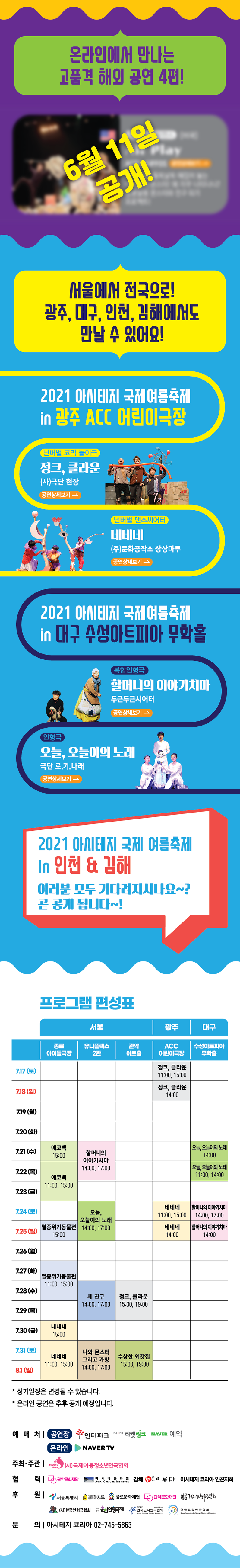 아시테지 국제여름축제는 국내·외 우수 아동청소년연극을 한자리에서 만나볼 수 있는 한국 최대 규모의 아동청소년을 위한 공연예술축제입니다.