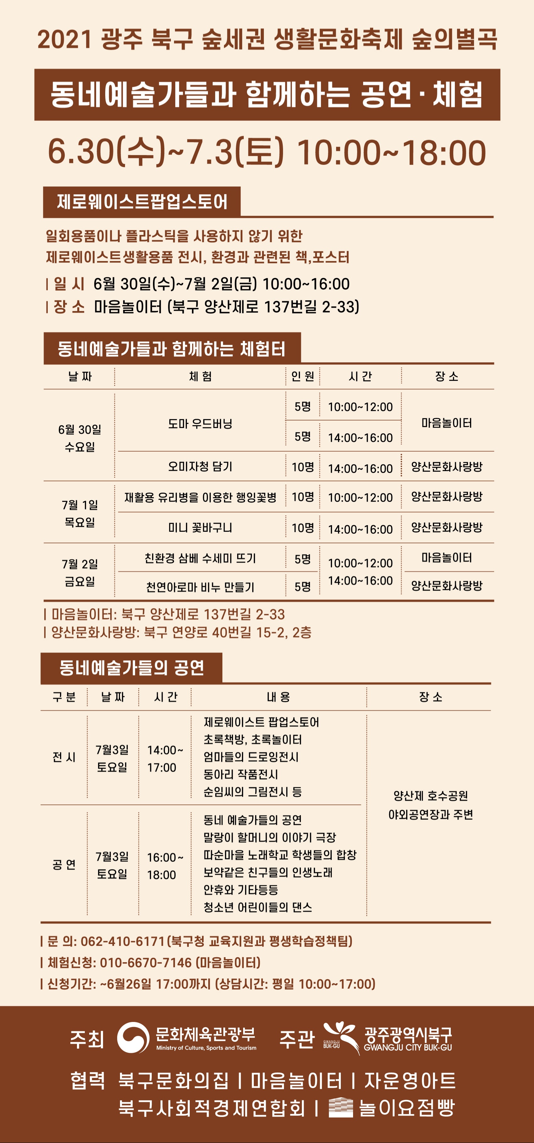 문화가 있는 날을 맞이하여 광주광역시 북구에서는 생활 숲세권에서 평생학습과 생활문화를 통해 도시와 사람을 치유하는 생활문화축제를 개최할 예정이오니 많은 참여 부탁드립니다.