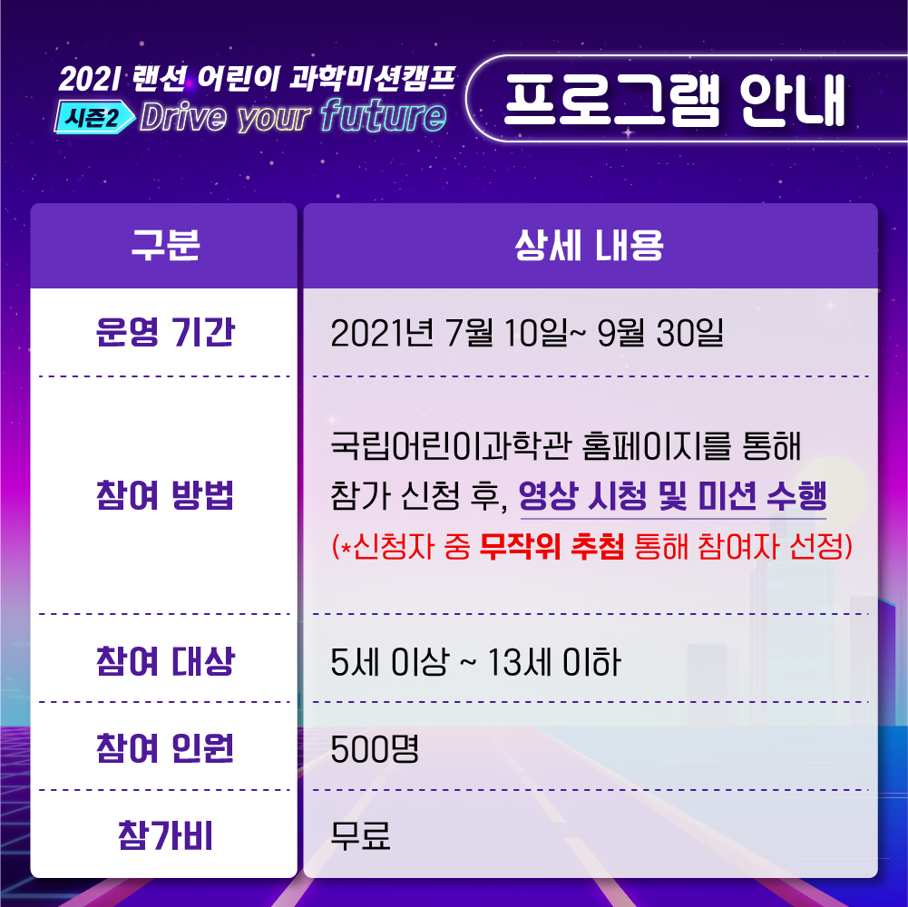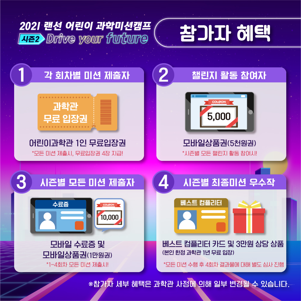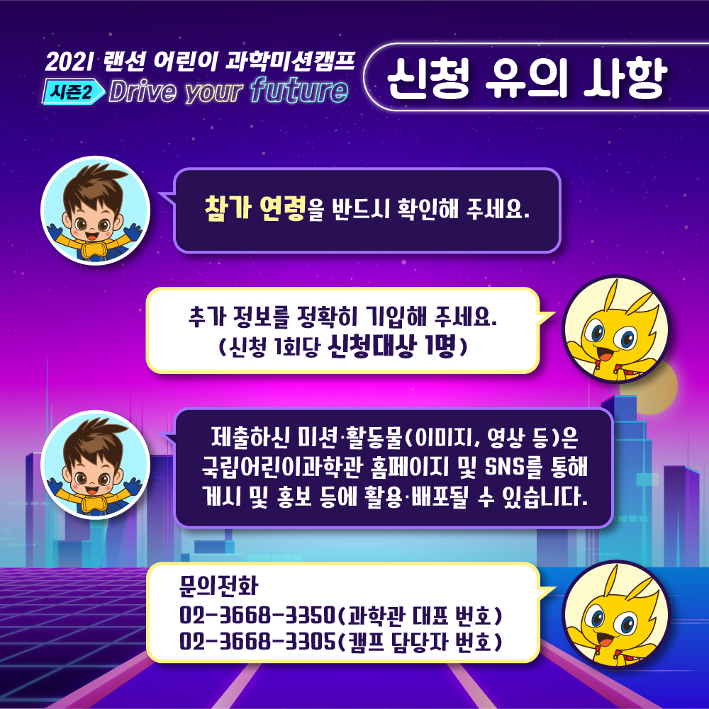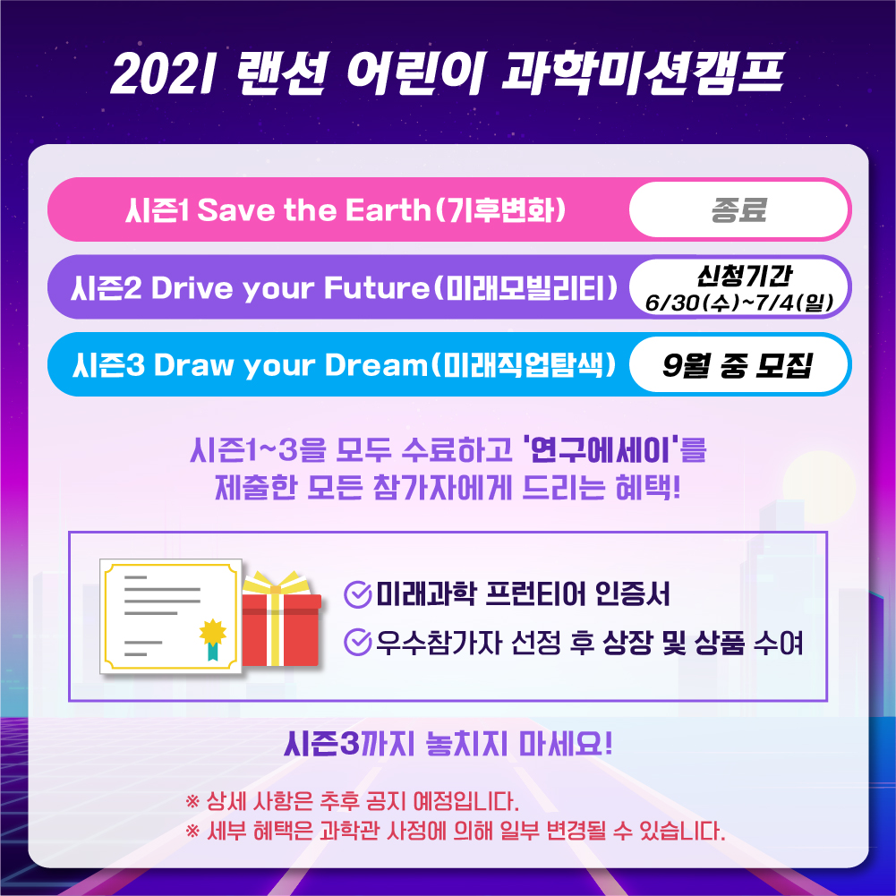 어린이들의 상상력을 마음껏 발휘하여 미션을 수행하고 멋진 선물도 받을 수 있는 '2021 랜선 어린이과학 미션캠프 시즌2'에도 많은 참여 바랍니다.