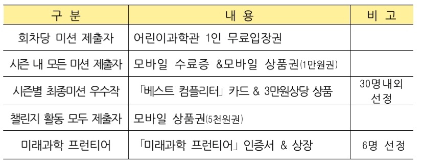 - 시즌1, 2, 3 모두 수료한 참가자 중 연구에세이"를 작성하여 제출한 분에게는 ‘미래과학 프런티어’ 인증서를 수여하고, 그 중 최우수상(1), 우수상(2), 장려상(3)을 선정하여 상장(과기부장관상, 과천과학관장상 등) 및 상품을 수여합니다.