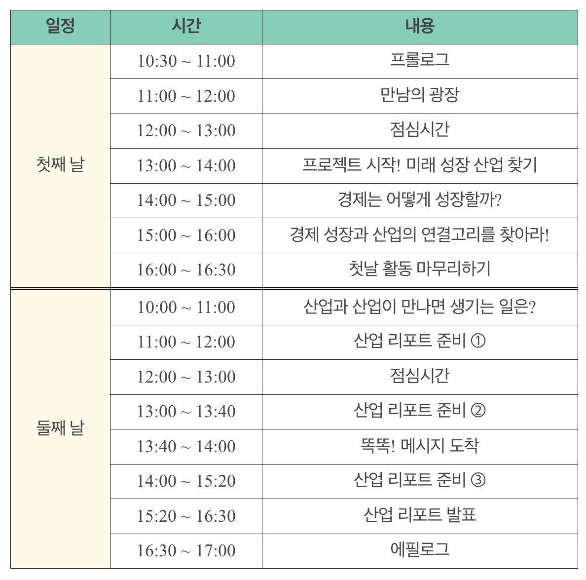 - 5~6명으로 구성된 모둠별로 특정 분야의 산업 자료를 분석·종합하며 산업 리포트를 완성한 후 발표하는 과정에서 현실 경제의 문제를 해결하는 역량을 키우는 프로그램