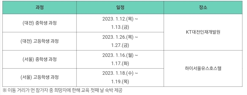 - 신청 자격: (중학생 과정) 2022학년도에 중학교 1~3학년에 재학했거나, 그에 준하는 연령대의 청소년