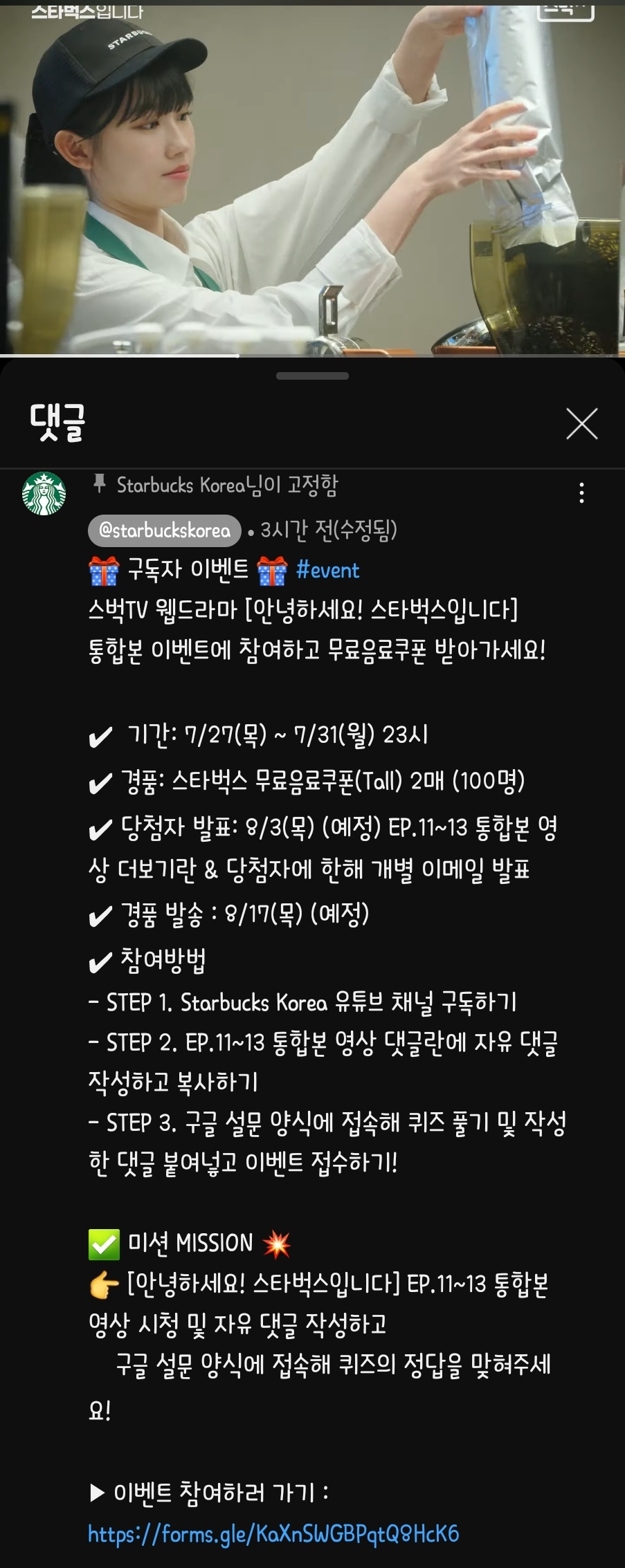 안녕하세요! 스벅TV입니다. 스벅TV 웹드라마 <안녕하세요! 스타벅스입니다> EP.11~13 통합본 이벤트에 참여하고 무료음료쿠폰 받아가세요! 이 설문지는 스벅TV 웹드라마 <안녕하세요! 스타벅스입니