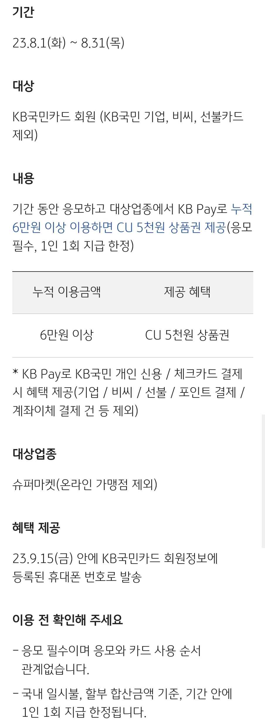 슈퍼에서 KB Pay 결제하면,CU 5천원 상품권 드려요! 기간 23.8.1(화) ~ 8.31(목) 대상 KB국민카드 회원 (KB국민 기업, 비씨, 선불카드 제외) 내용 기간 동안 응모하고 대상업종에서 KB Pay로 누적 6만원 이상