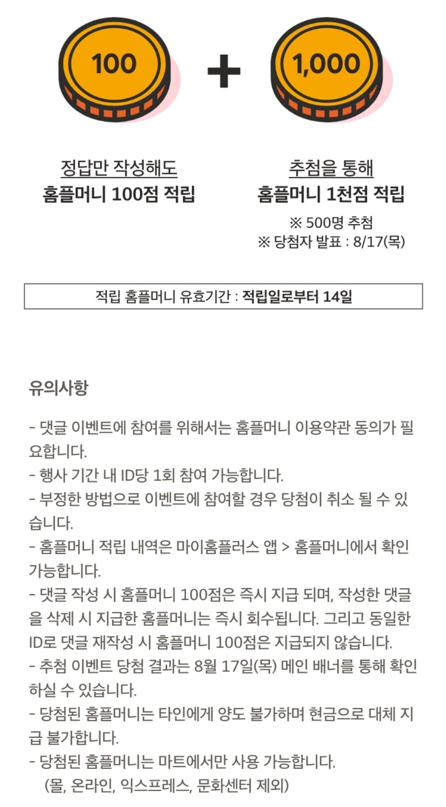 추첨을 통해 홈플머니 1000점 적립 (500명 추첨)