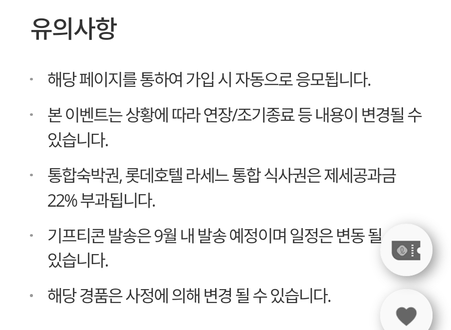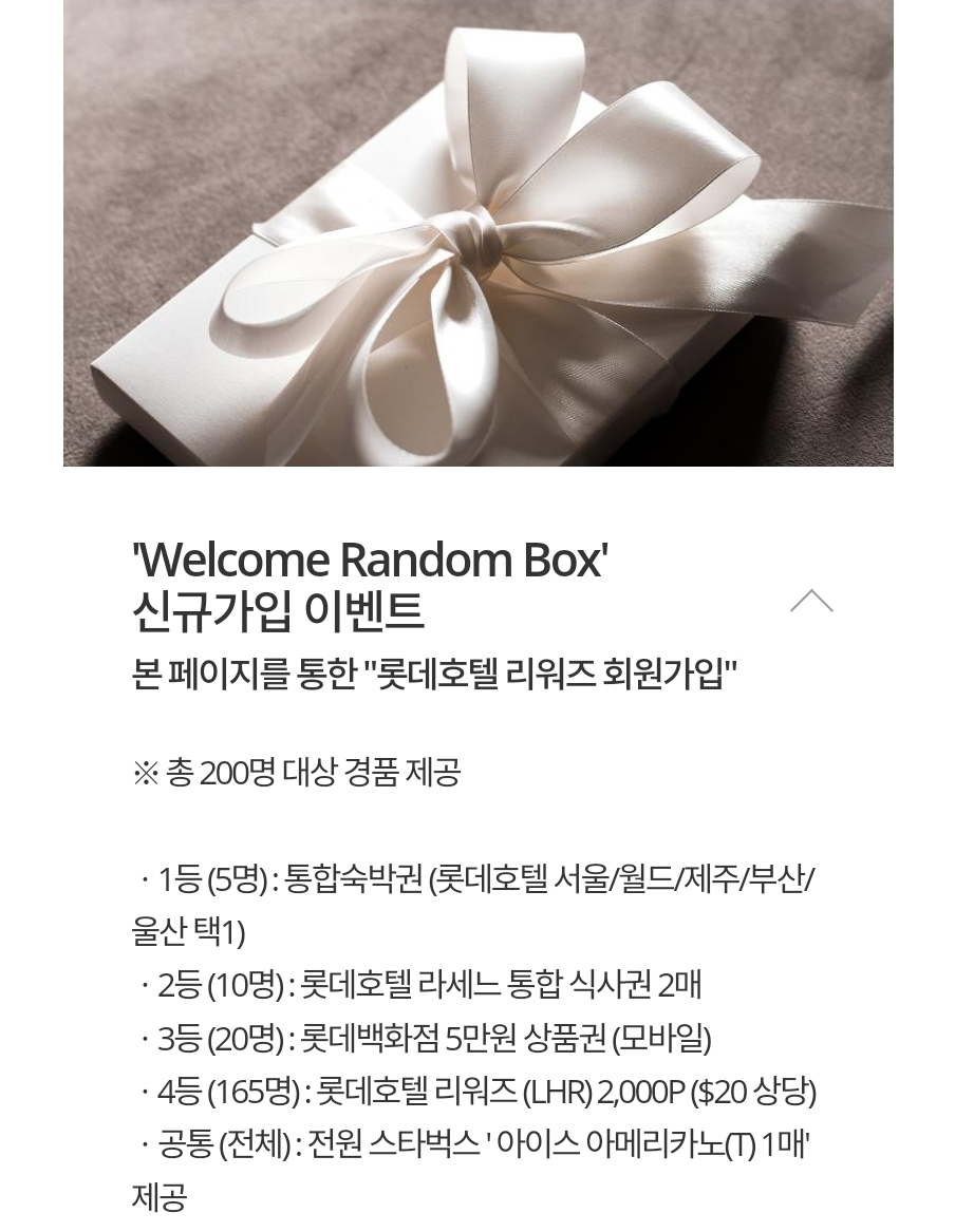 ※ 총 200명 대상 경품 제공 ㆍ1등 (5명) : 통합숙박권 (롯데호텔 서울/월드/제주/부산/울산 택1) ㆍ2등 (10명) : 롯데호텔 라세느 통합 식사권 2매 ㆍ3등 (20명) : 롯데백화점 5만원 상품권 (모바일) ㆍ4