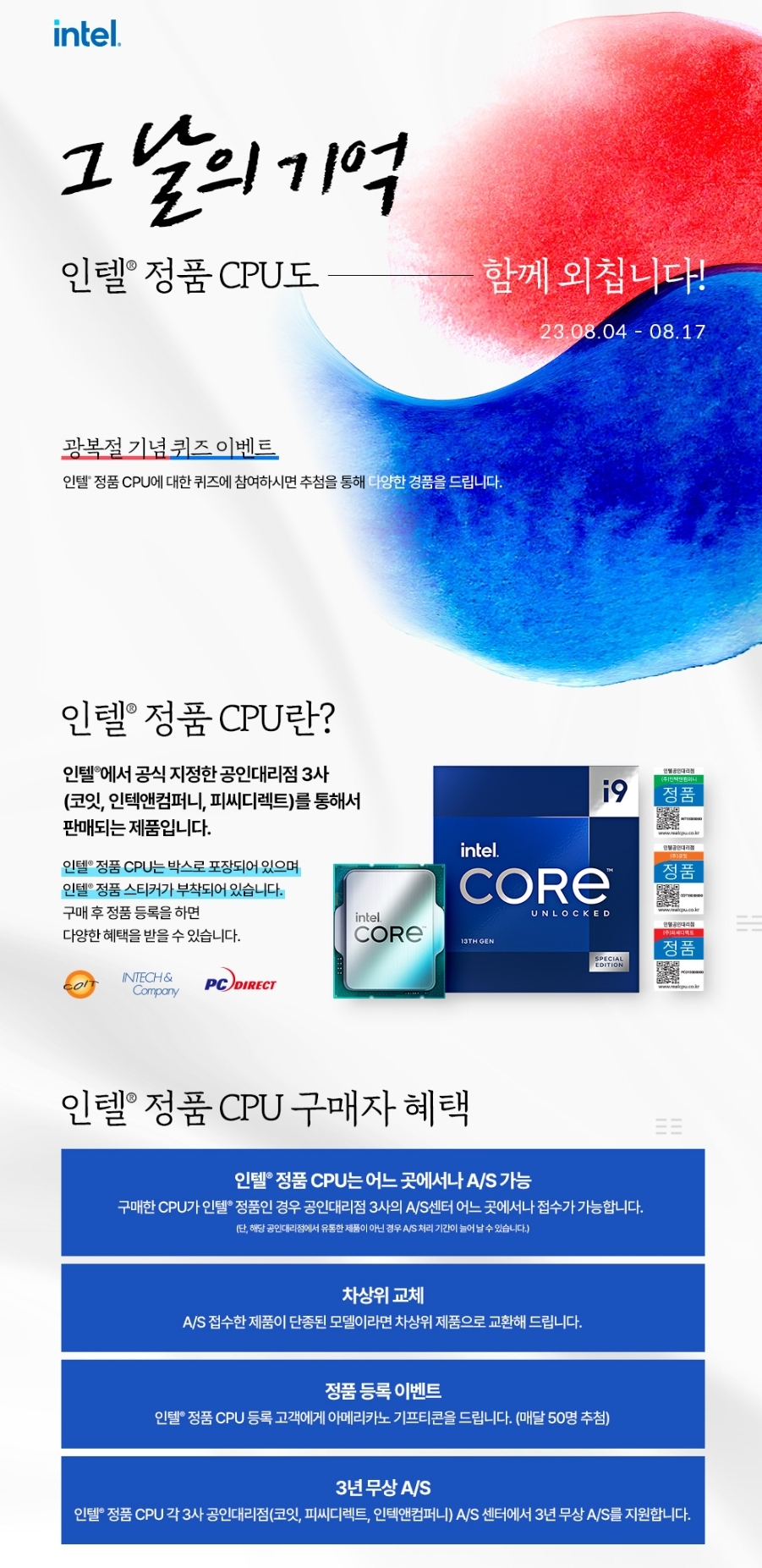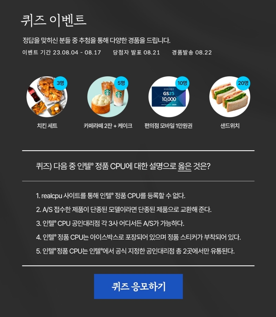 카테고리 없음 앱테크. 인텔 정품 cpu 퀴즈 풀고 추첨 치킨 받으세요~ (~8.17) by 노랑킹콩 2023. 8. 11. 로그인 ❌️정답 : 3번 https://allaboutpc.co.kr/Event/EventInfoView.asp?IdxEventInfo=456 IT정보포털 www.allaboutpc.co.kr 공유하기 게시글 관리 노랑킹콩의 여행 댓글
