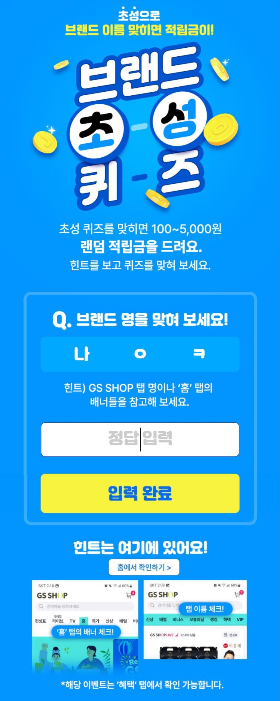 카테고리 없음 앱테크. GS SHOP 초성퀴즈 맞추고 최대 5,000포인트 받으세요 by 노랑킹콩 2023. 8. 16. 로그인⭕️정답 : 나이키 https://event.gsshop.com/event/initial-quiz GS SHOP 초성 퀴즈 이벤트브랜드 초성퀴즈 맞히고 적립금 받아가세요!event.gsshop.com 공유하기 게시글 관리 노랑킹콩의 여행 댓글