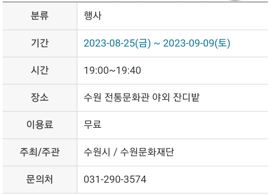 문의처 : 수원문화재단 문화재축제부 문화유산활용팀(031-290-3574)