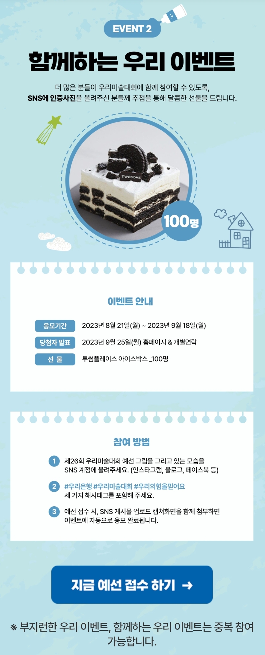 우리미술대회를 sns에 인증사진 올려주싱 분들 추첨해서 투썸플레이 케이크 100분 드려요.
