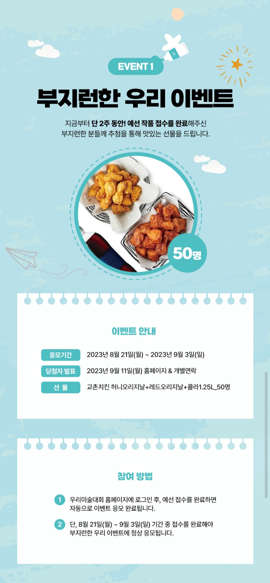 9월 3일까지 예선작품 접수 완료해 주신 분들 추첨해서 교촌 허니 오리지널 + 레드 오리지널 + 콜라 50명 드려요.