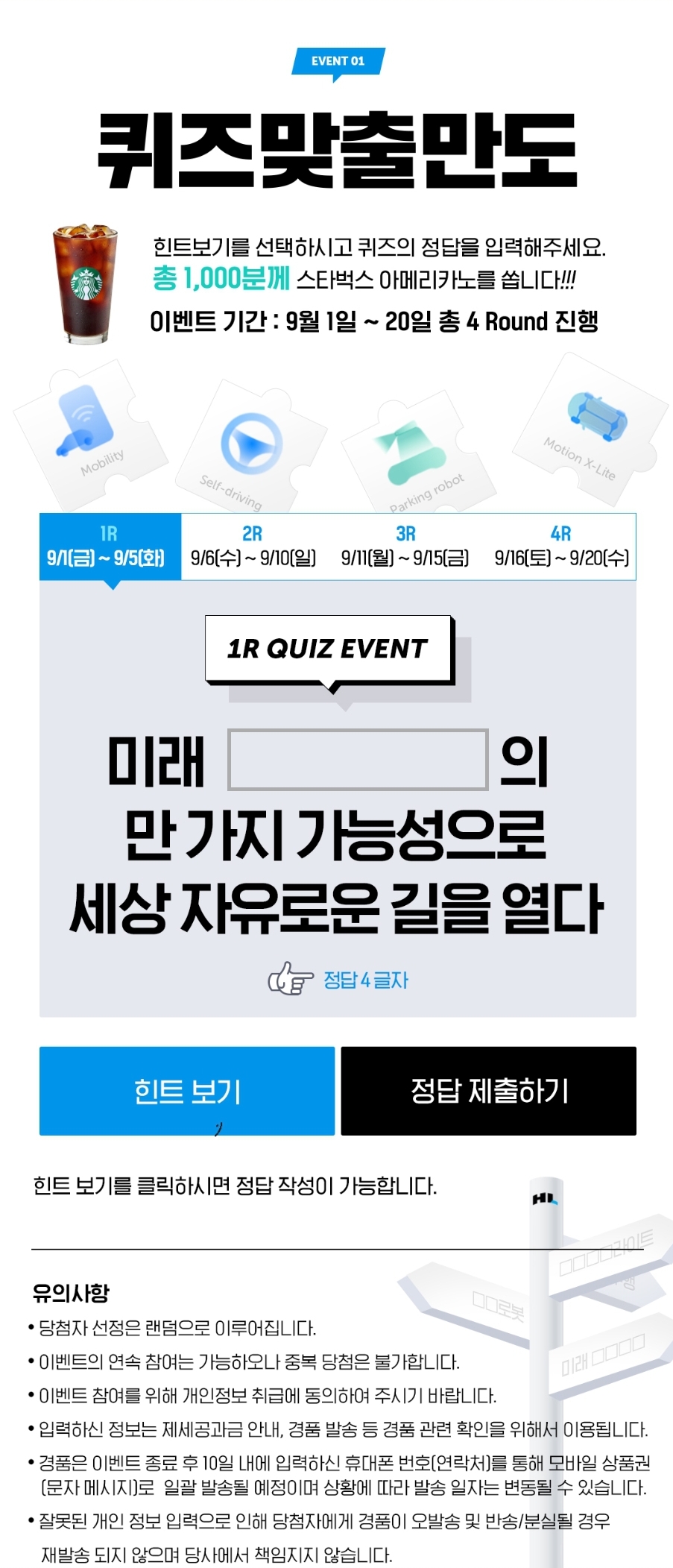 앗!!!!!! 노랑킹콩네 만도 퀴즈이벤트 스벅 당첨됐어요!!!^^ 날마다 도전~~~~~ 🫶 https://yellowkong.tistory.com/m/928 앱테크. HL 만도 퀴즈 맞추면 스벅 1000명 추첨 증정 (~9.20)로그인 ❌ 힌트보기 누르고 돌