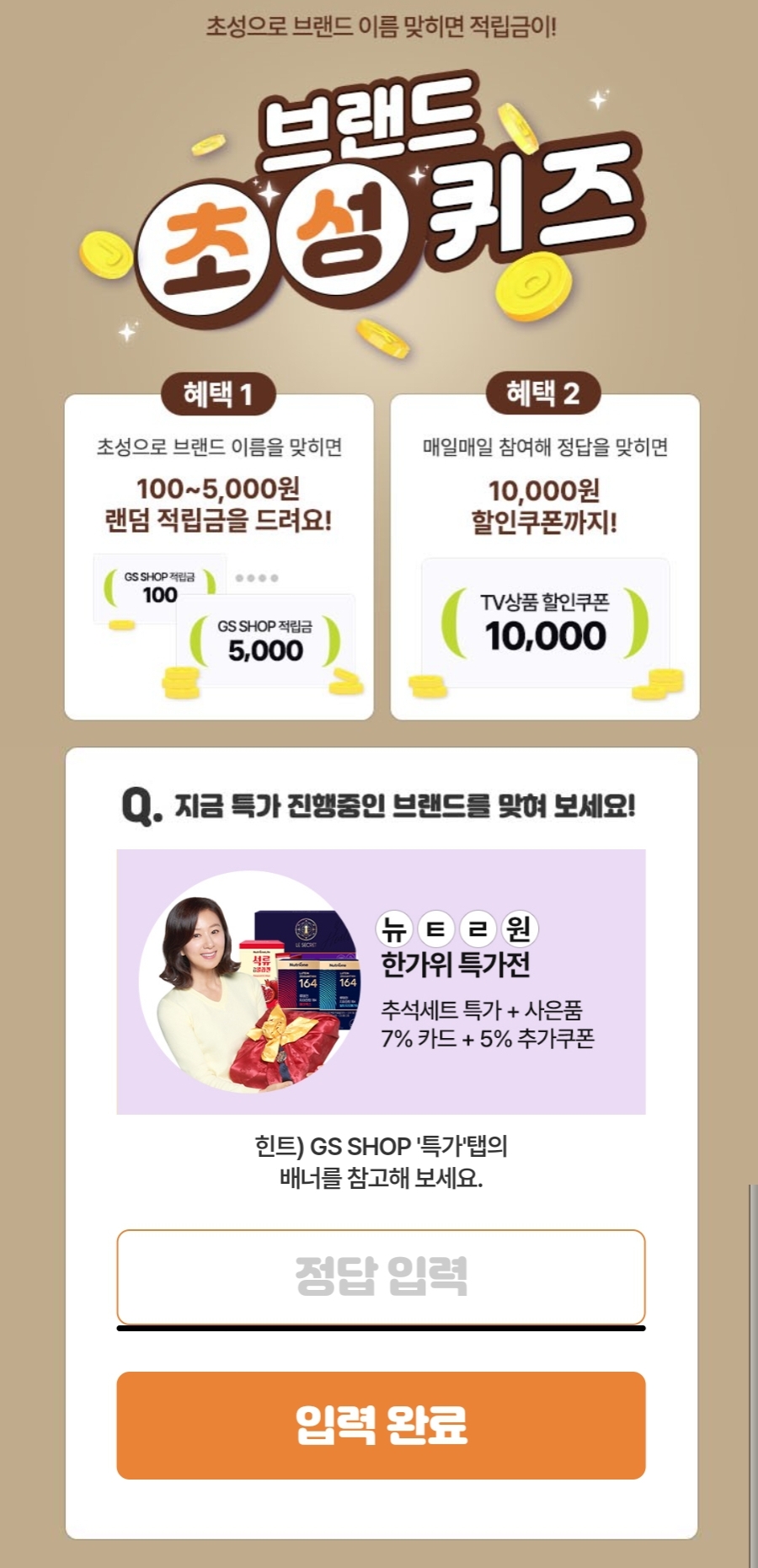 카테고리 없음 [GS SHOP] 초성퀴즈 맞추고 최대 5000원 포인트 받으세요 by 노랑킹콩 2023. 9. 14. 로그인 ⭕️정답: 뉴트리원 https://event.gsshop.com/event/initial-quiz GS SHOP 브랜드 초성 퀴즈브랜드 초성퀴즈 맞히고 적립금 받아가세요!event.gsshop.com 공유하기 게시글 관리 노랑킹콩의 여행 댓글