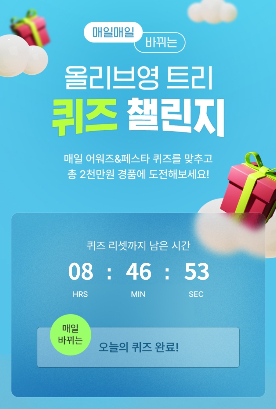 [올리브영] 매일 퀴즈 풀고 투썸 라떼2잔 응모하세요 (~12.17)